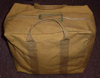 AIRCREW PARACHUTE BAG Tan canvas parachute bag. These were intended to be used for storing and carrying parachutes but are frequently seen in use as a carrying bag for aircrew kit. Patterned on an original Irvin Airchute design. NOTE: There were several different patterns of parachute bags seen during WW2. Approximate size is: 15 inches tall x 18 inches long x 10 inches wide. Available with or without the Irvin Air Chute, Ltd stamp on the upper flap. In Stock |